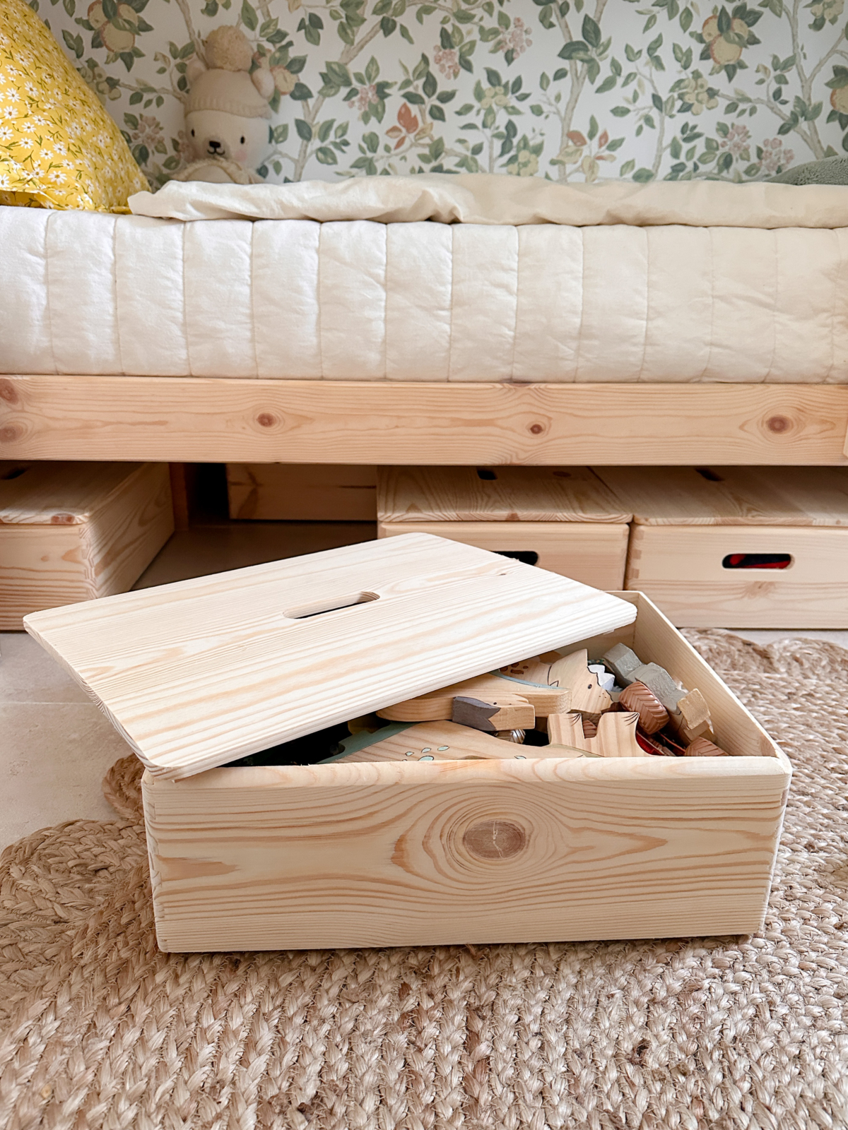 Las cajas de madera son una solución muy versátil. Puedes colocarlas en estanterías, en armarios, apilarlas en cualquier rincón de la casa o incluso debajo de la cama (un espacio muchas veces olvidado). Ayudan a aprovechar el espacio disponible y a mantener los juguetes recogidos sin complicaciones.