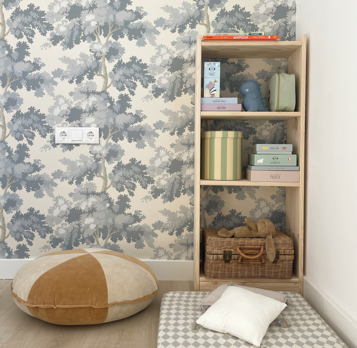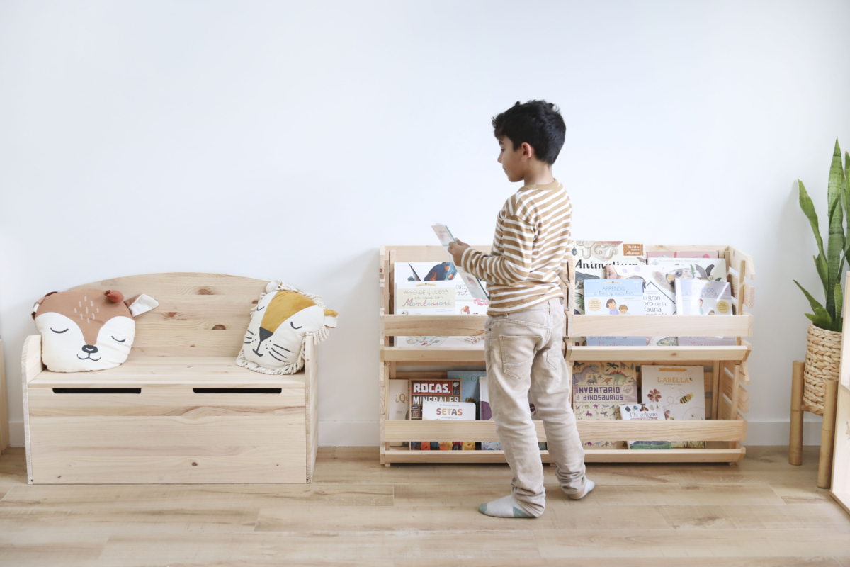 El clásico que nunca falla. Un baúl de madera es perfecto para guardar juguetes voluminosos como peluches, juegos grandes o juguetes que se usan a diario. Además de práctico, aporta calidez y puede integrarse fácilmente tanto en la habitación infantil como en el salón. Y si es un banco baúl al mismo tiempo, mejor que mejor.