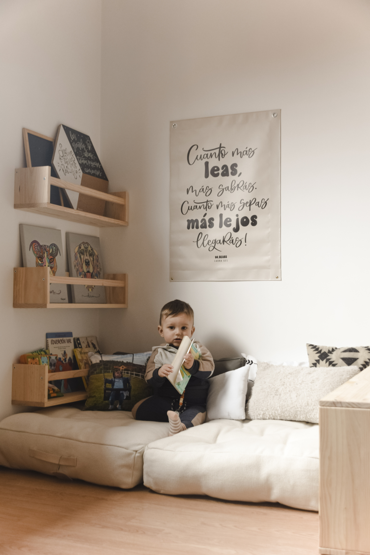 Cuando el espacio es limitado, las paredes se convierten en grandes aliadas. Los estantes especieros, por ejemplo, funcionan genial para colocar cuentos de cara. También puedes colgar estanterías de cubo en la pared para aprovechar la altura y liberar suelo.