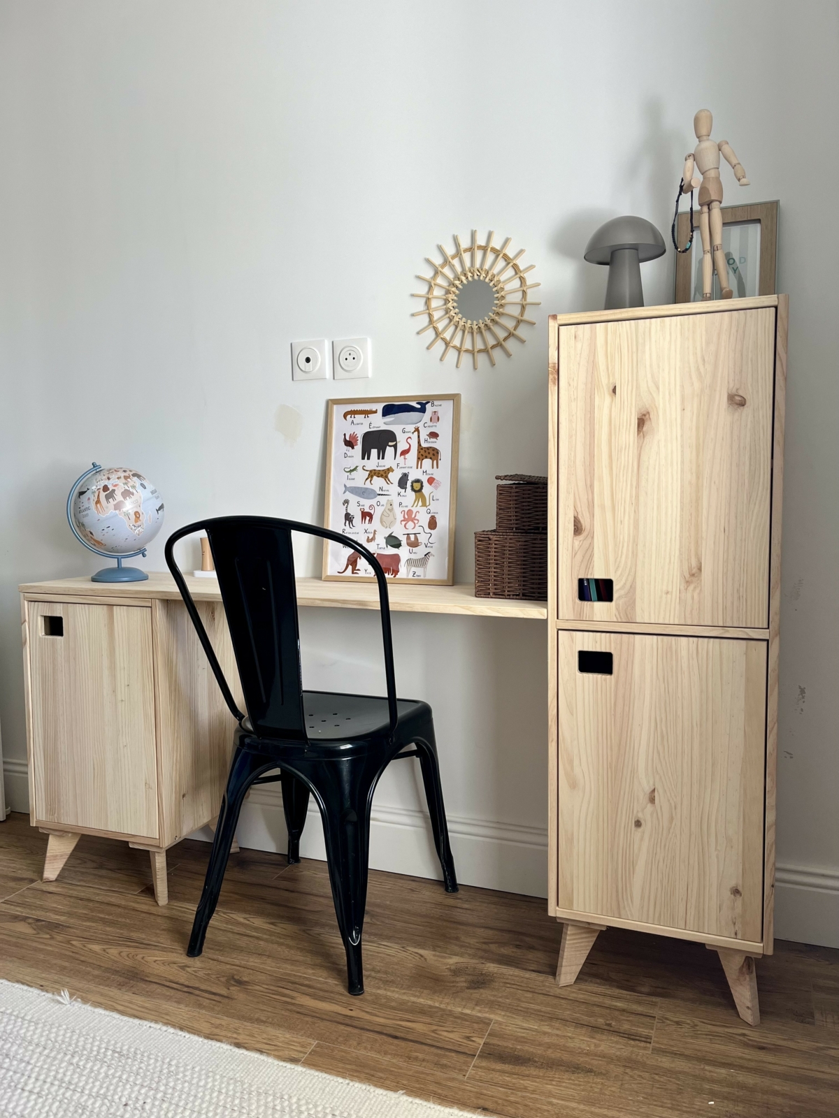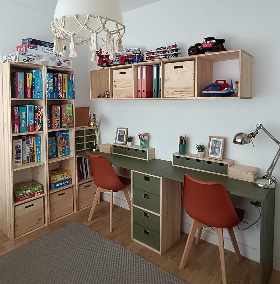 Otra propuesta práctica consiste en crear un escritorio utilizando nuestros armarios DINAMIC como patas y un tablero a medida encima. Los armarios no solo sostienen la mesa, sino que aportan espacio extra para guardar juguetes, material escolar o libros.