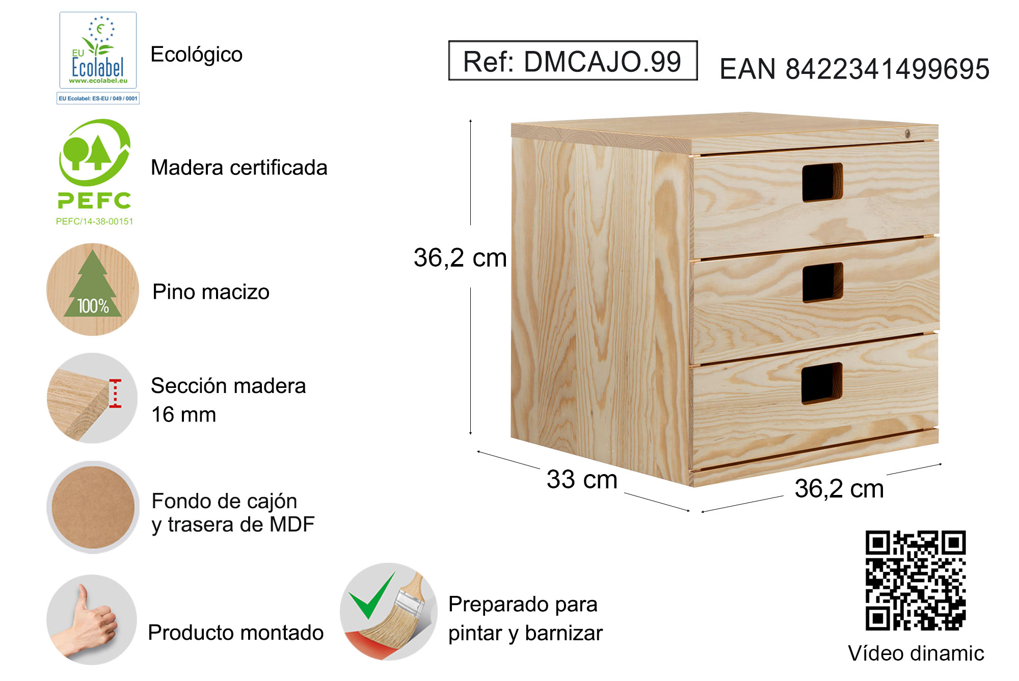 - Cajonera Dinamic de madera maciza de pino con 3 cajones. Fondo de cajón y trasera de mdf.