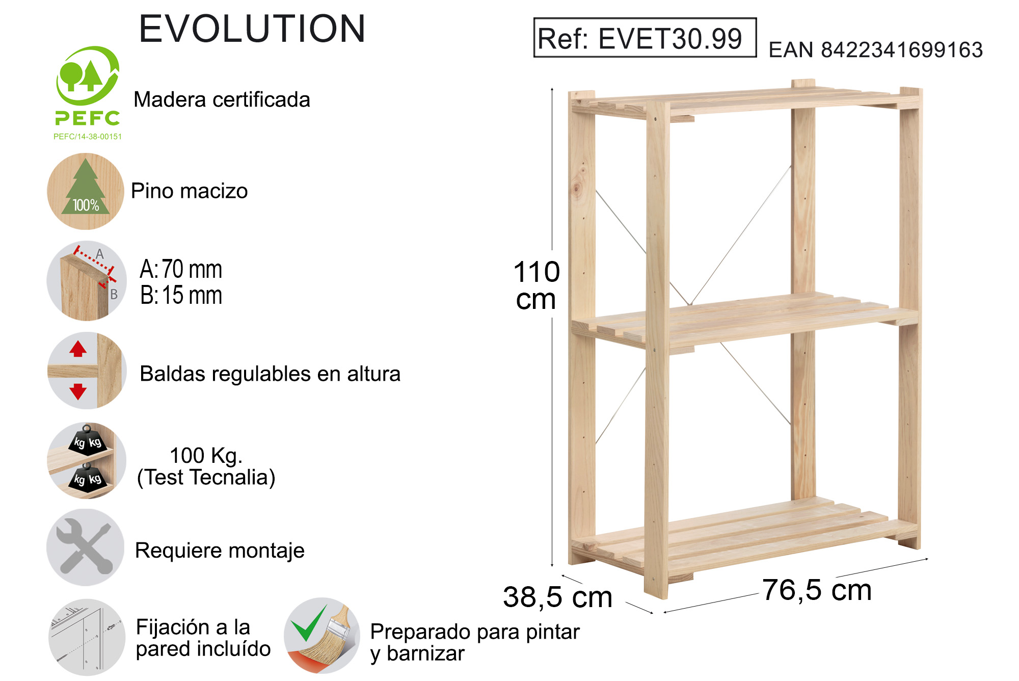 No más trastos en el trastero. Deshazte de todo aquello que ya no utilices y encuentra a la primera lo que buscas. Imprescindible: una buena estantería robusta y resistente. En Astigarraga Kit Line te ayudamos a organizar y ordenar el trastero (despensa, garaje, taller, desván...) con esta estantería de madera maciza de pino de la serie EVOLUTION. Mide 110x76,5x38,5cm (alto/ancho/fondo) y sus 3 baldas alistonadas regulables en altura te van a permitir almacenar los alimentos, los productos de limpieza, las herramientas o los objetos que desees de manera organizada.