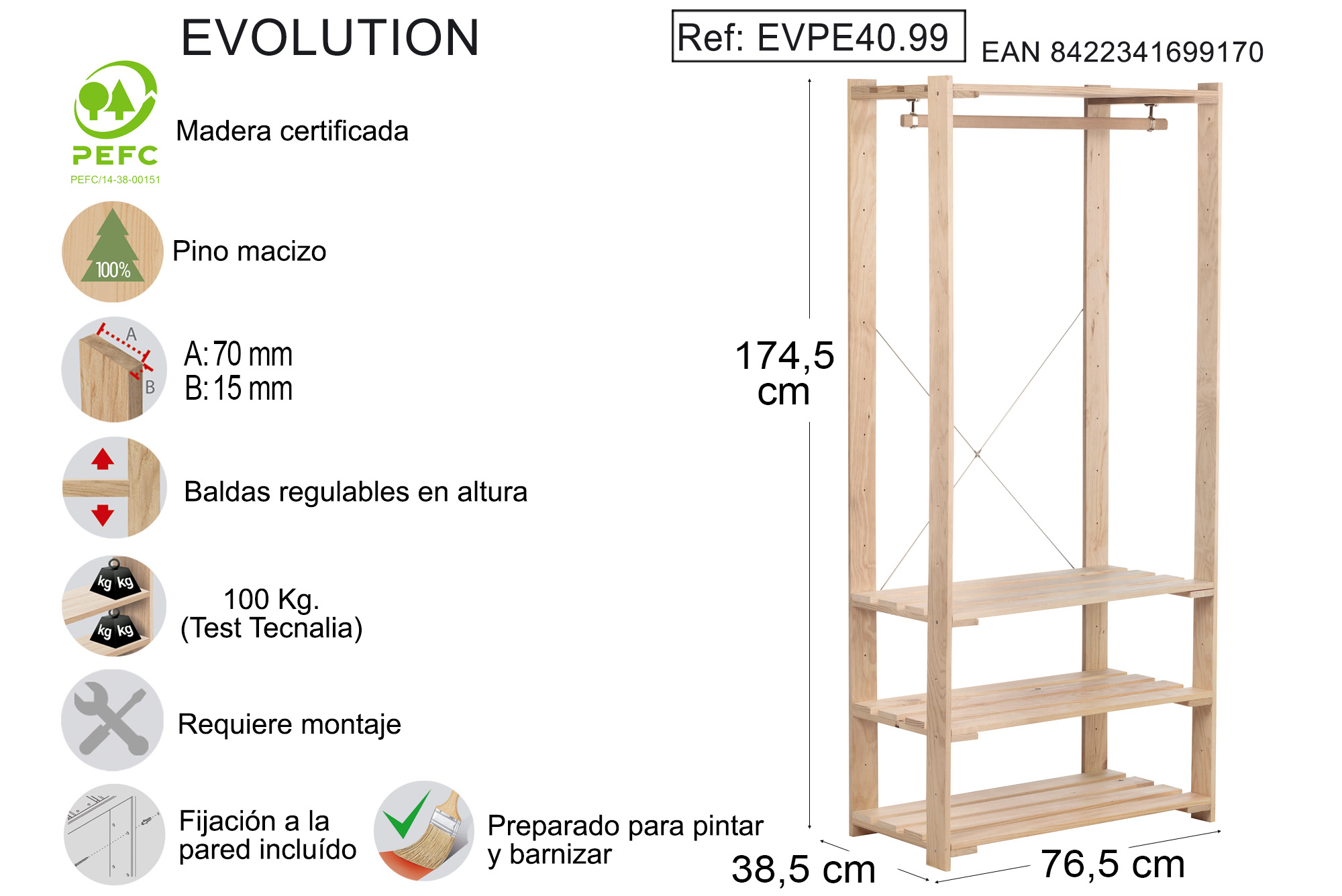 Perchero, armario abierto, burro, vestidor... Llámalo como quieras. Nosotros: perchero y como siempre, de madera maciza certificada. Este mueble ecológico de la serie EVOLUTION está compuesto por una barra superior de metal para las perchas y tres baldas de madera inferiores regulables en altura para que puedas colocarlas a tu gusto y según tus necesidades.