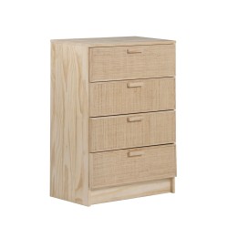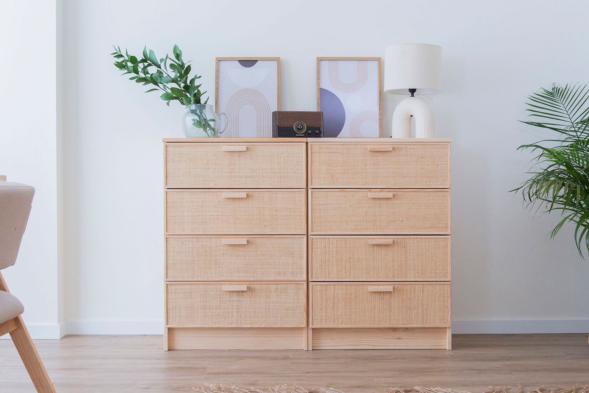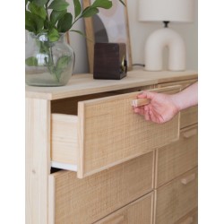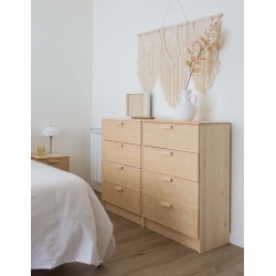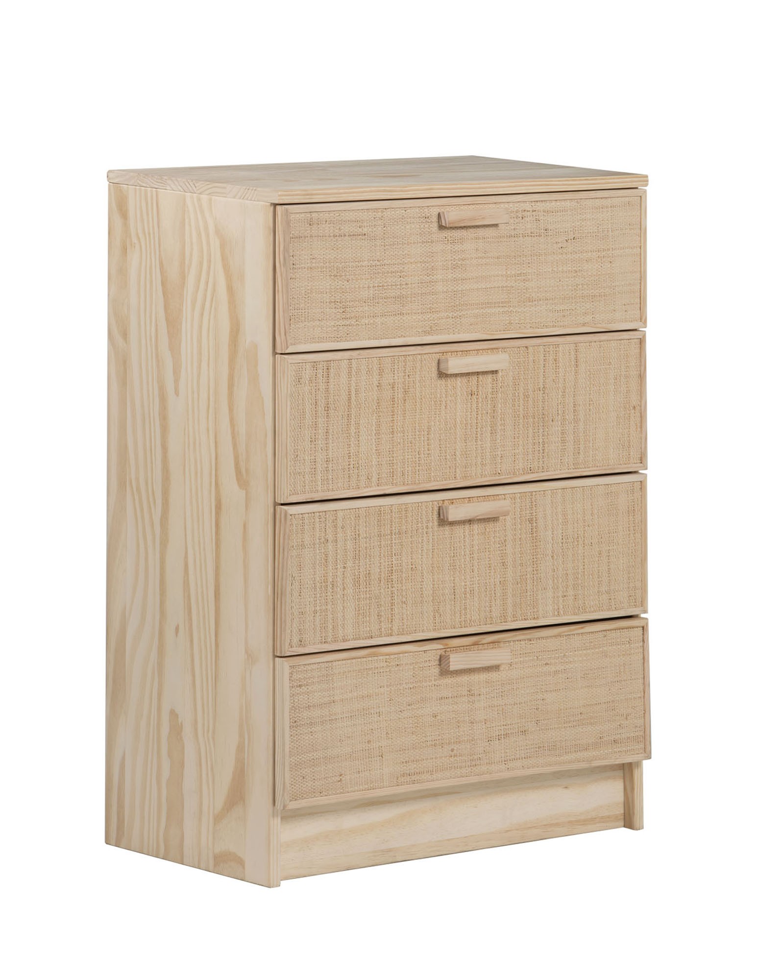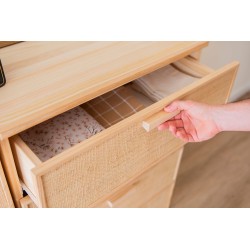 Esta cómoda de rafia combina la madera maciza de pino de origen sostenible (certificado PEFC), y la rafia natural, en los frontales de sus cuatro cajones. La rafia, una fibra de origen vegetal, aporta una textura suave y cálida que da a esta pieza personalidad, mientras que la robustez de la madera asegura resistencia y promete acompañarte durante muchos años. Los cajones están fabricados a mano, siguiendo un proceso artesanal: desde el corte del marco y la colocación de la rafia, hasta el sellado y el lijado final, dando como resultado un acabado único y lleno de carácter.