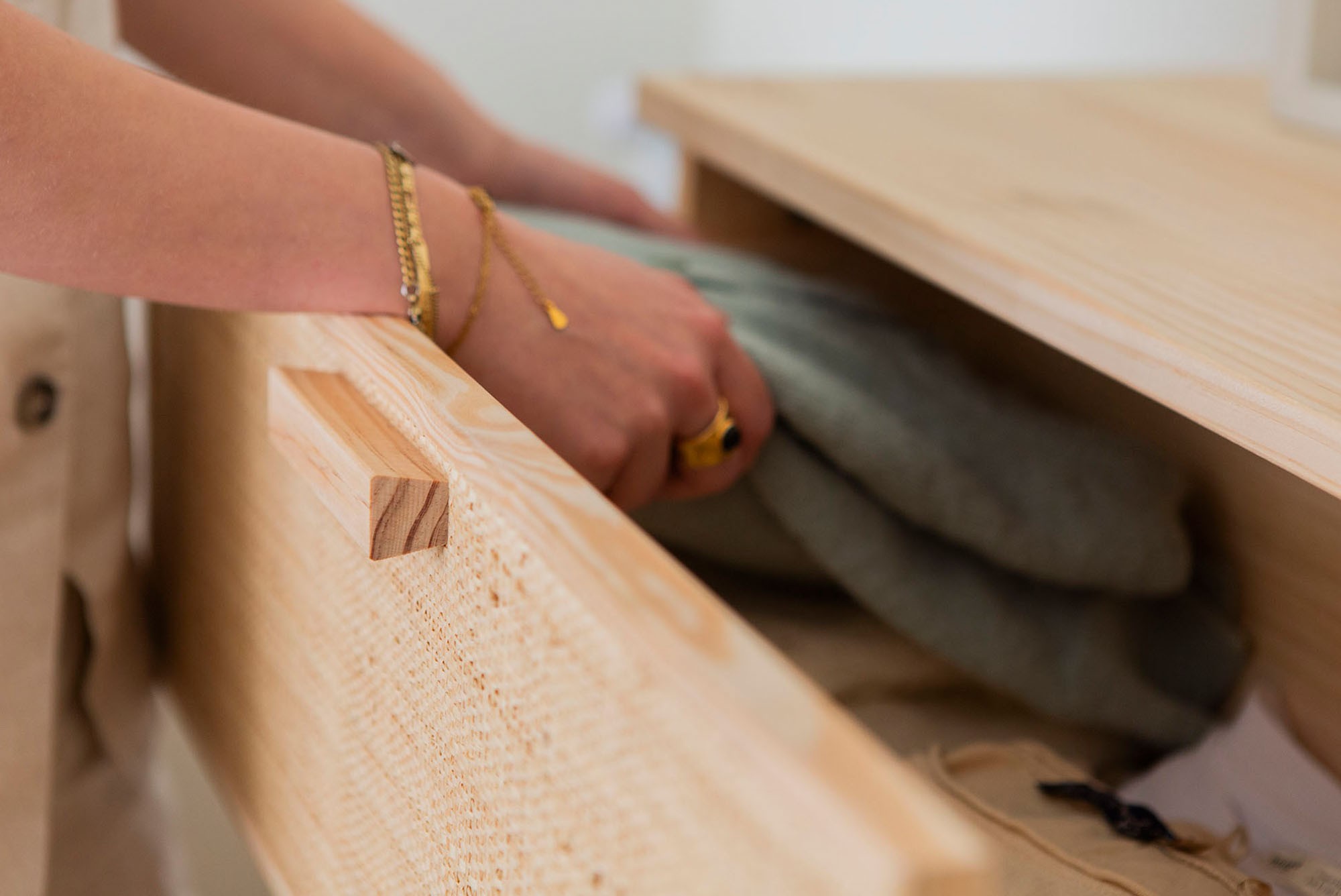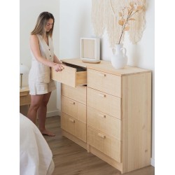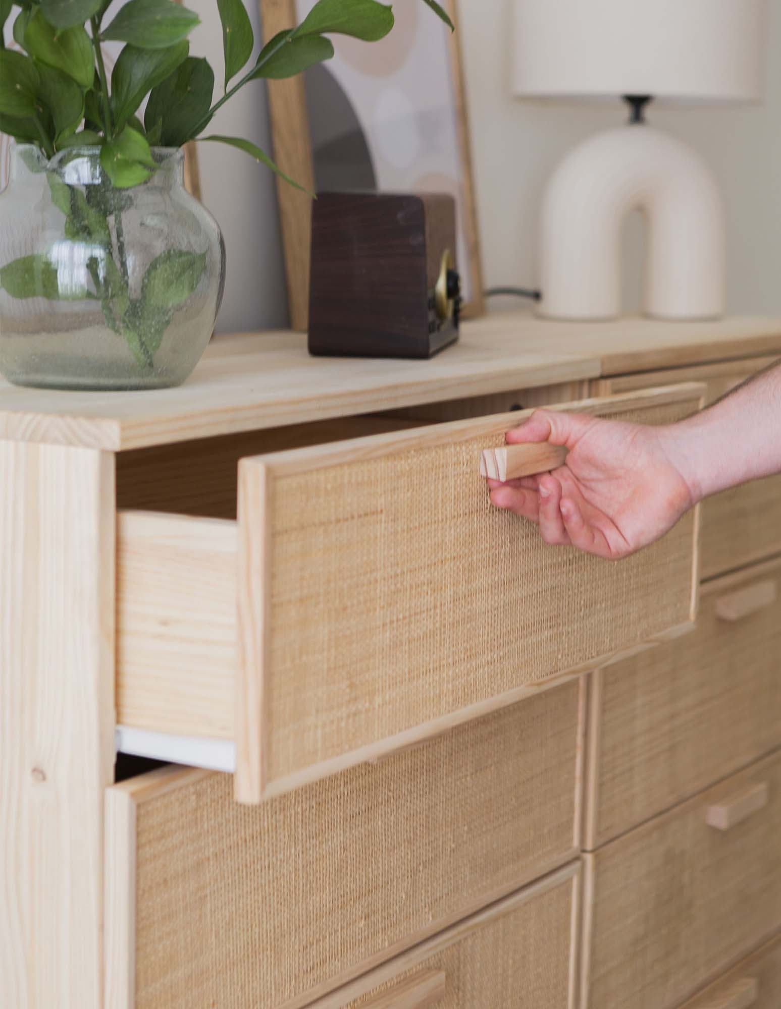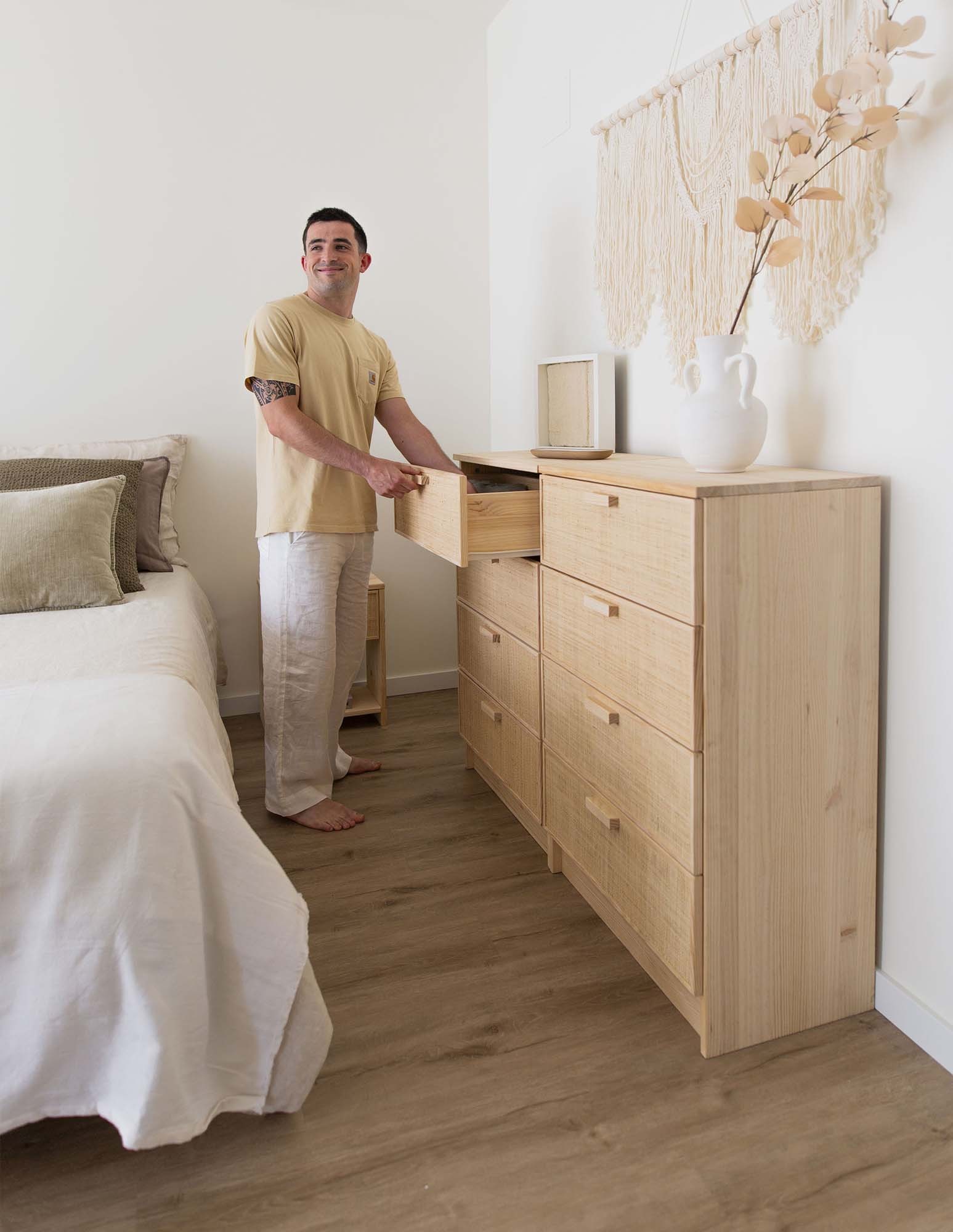Esta cómoda de rafia combina la madera maciza de pino de origen sostenible (certificado PEFC), y la rafia natural, en los frontales de sus cuatro cajones. La rafia, una fibra de origen vegetal, aporta una textura suave y cálida que da a esta pieza personalidad, mientras que la robustez de la madera asegura resistencia y promete acompañarte durante muchos años. Los cajones están fabricados a mano, siguiendo un proceso artesanal: desde el corte del marco y la colocación de la rafia, hasta el sellado y el lijado final, dando como resultado un acabado único y lleno de carácter.