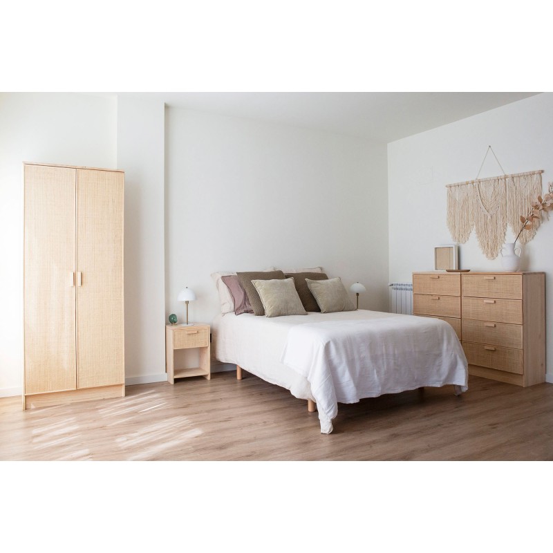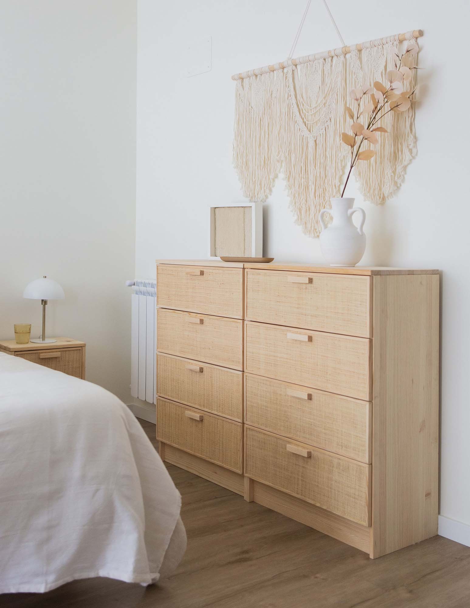 La cómoda de rafia es una pieza pensada para hacerte la vida más fácil. En el dormitorio podrás ganar espacio para guardar ropa, sábanas o textiles; en el salón o el comedor te resultará práctica para odenar la mantelería; en el recibidor te ayudará a tener a mano lo que necesitas en el día a día; en una habitación infantil siempre te será útil para guardar la ropita de los más pequeños; y en un rincón de trabajo se convertirá en un apoyo perfecto para organizar papeles. Además, la superficie superior es ideal para colocar objetos decorativos, plantas o fotografías, aportando más carácter al espacio.