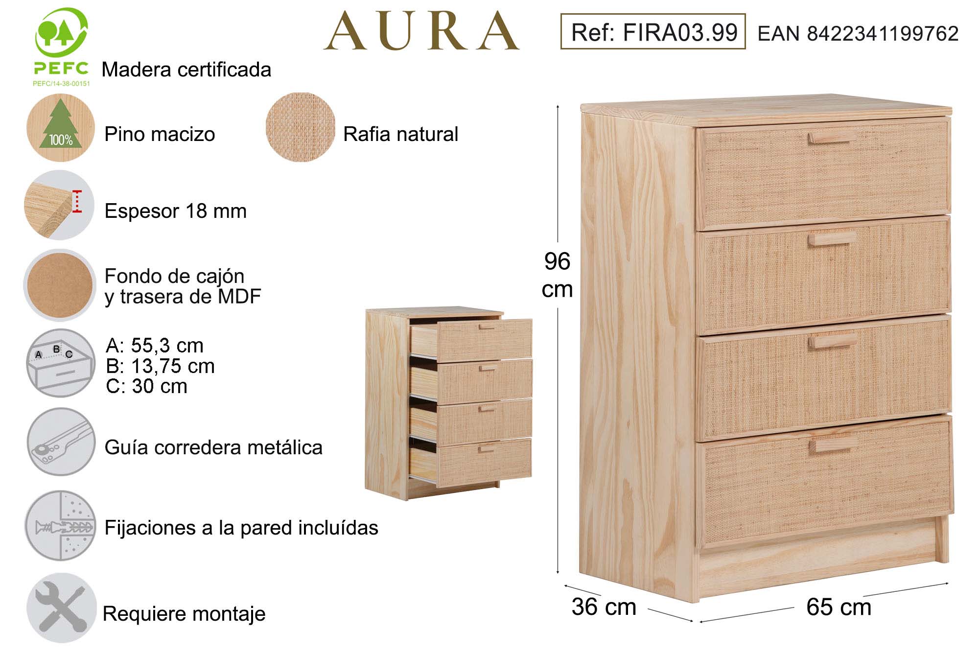 • Cómoda AURA de 4 cajones de rafia natural fabricados a mano
