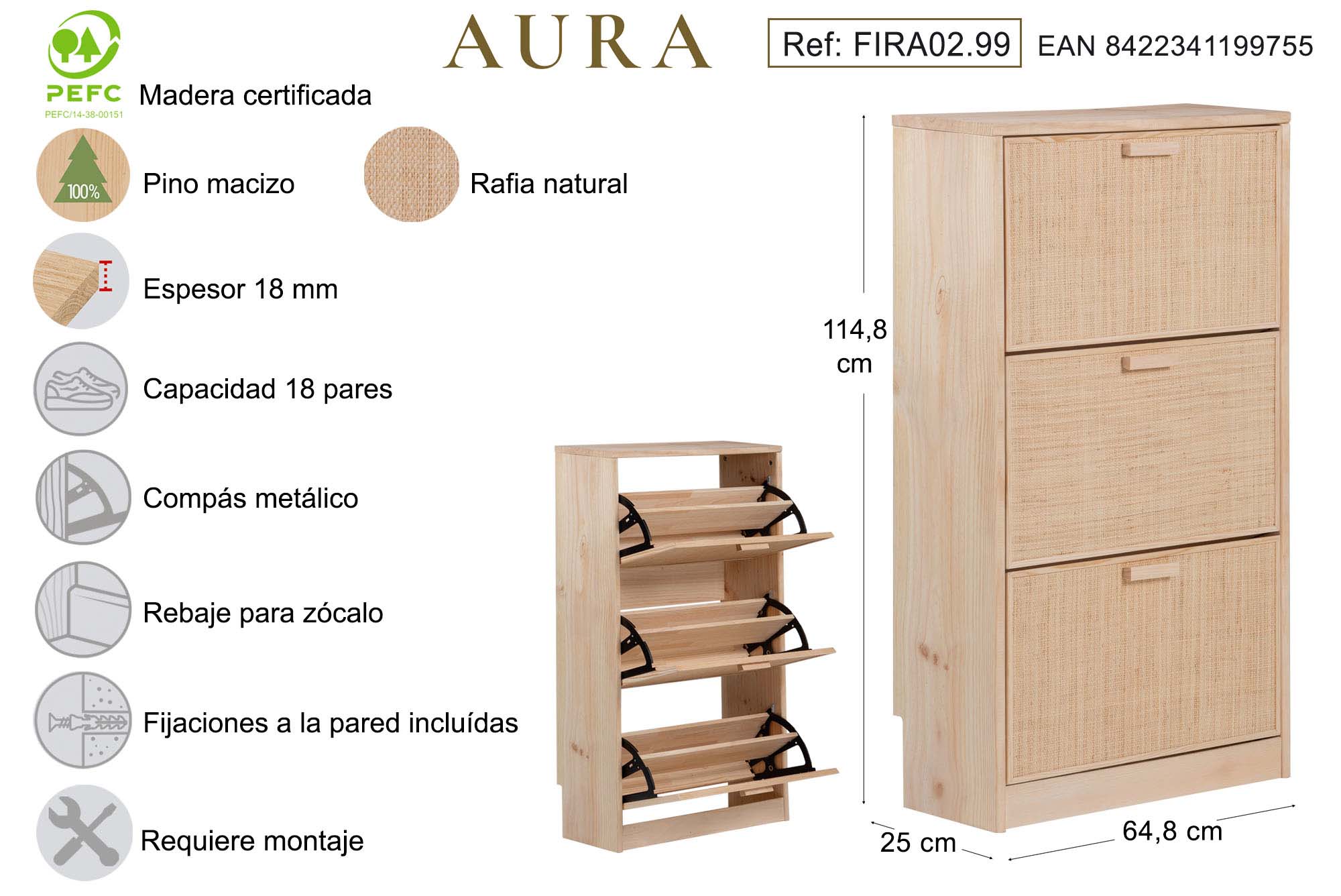 • La colección AURA consta de 5 piezas combinables entre si: armario, aparador, cómoda, mesita de noche y este zapatero de rafia