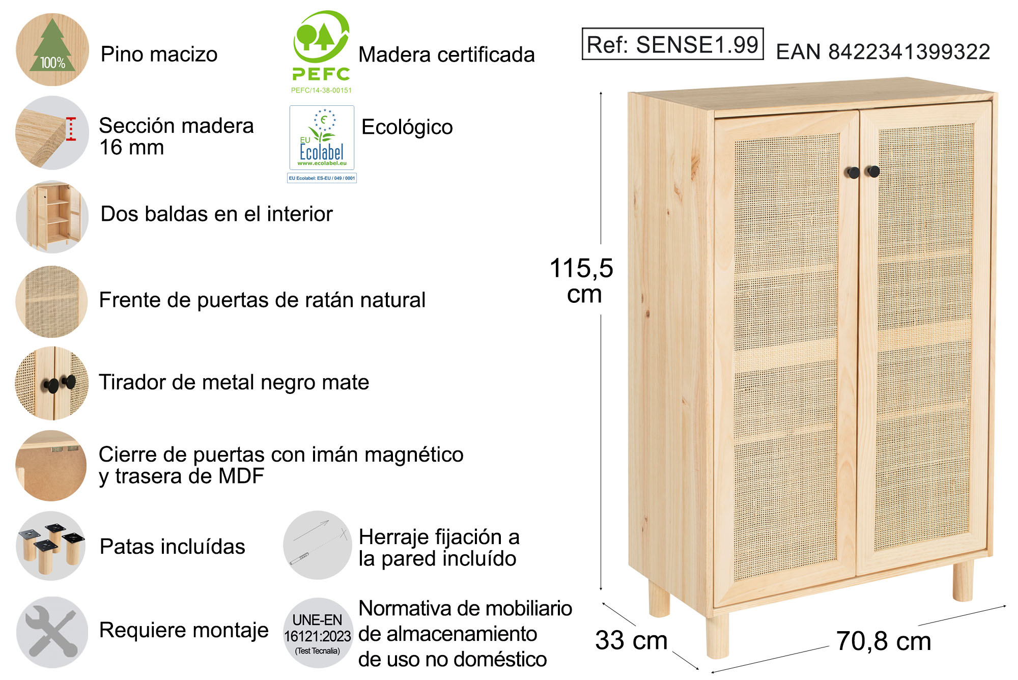Este mueble cumple con la normativa UNE-EN 16121:2023, pensada para asegurar la calidad y resistencia del mobiliario de almacenamiento en espacios no domésticos. Perfecto para un uso profesional con total confianza. Lo puedes combinar con el resto de muebles de ratán de la colección SENSE para conseguir un conjunto más armonioso. Cada pieza está diseñada cuidadosamente para realzar la textura artesanal del ratán y las vetas y nudos de la madera de pino, aportando una armonía y belleza natural únicas. Incorpora el armario de 2 puertas de ratán en tu decoración y crea un ambiente natural y sostenible. Tu hogar es tu refugio y se merece esta pieza exclusiva.