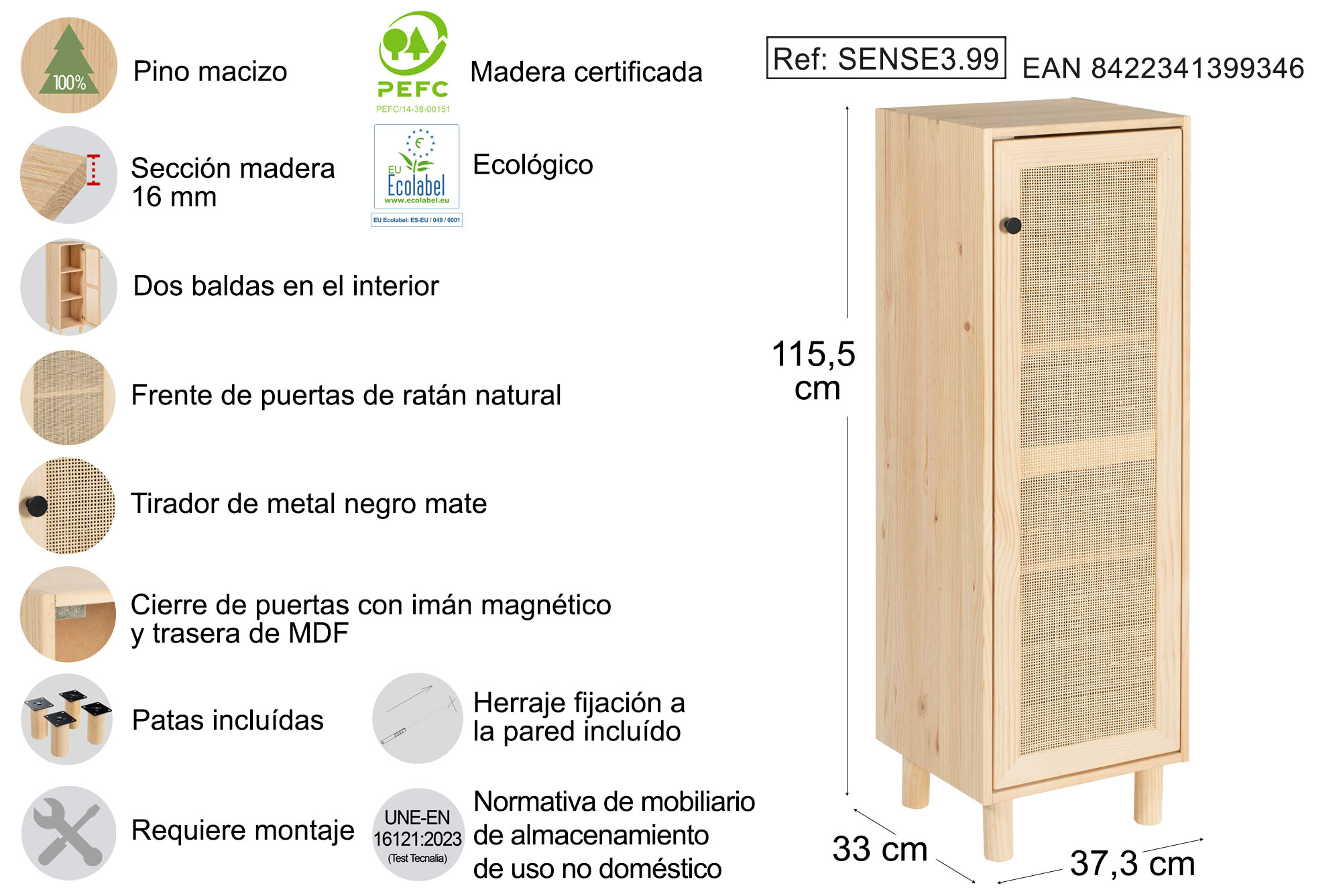 Independientemente de su lugar, esta pieza artesanal aportará carácter e identidad. Cada pieza de la colección SENSE está diseñada para realzar la textura artesanal del ratán y las vetas y nudos de la madera de pino, y para poder sentir y disfrutar de una pequeña parte de la naturaleza en el hogar. Apuesta por este armario vertical de 1 puerta de ratán en tu hogar, utilízalo individualmente o combina varios módulos de diversos tamaños, y ¡notarás cómo tu espacio se vuelve más natural, exclusivo y sostenible!