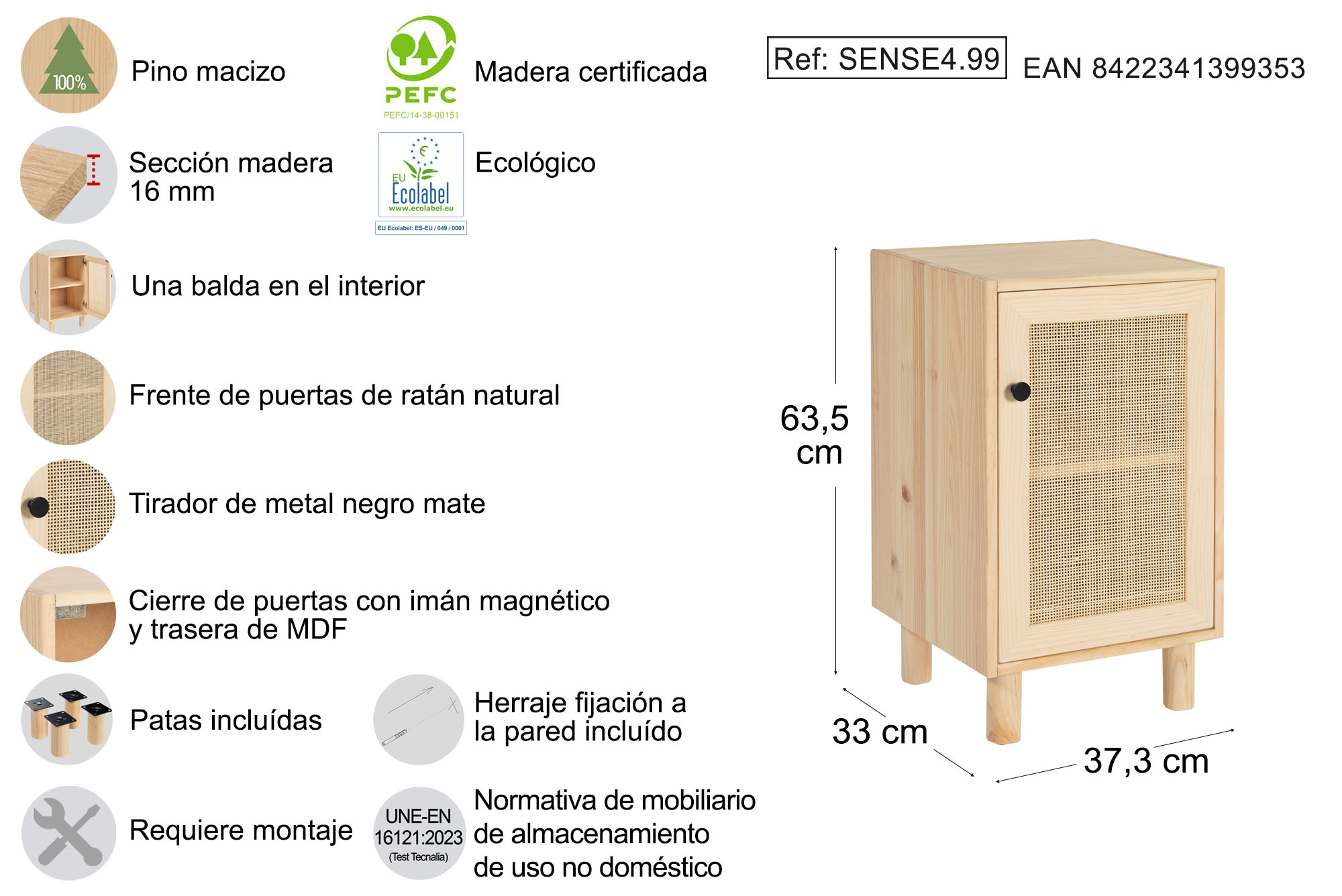 Este mueble cumple con la normativa UNE-EN 16121:2023, pensada para asegurar la calidad y resistencia del mobiliario de almacenamiento en espacios no domésticos. Perfecto para un uso profesional con total confianza. Lo puedes combinar con el resto de muebles de ratán de la colección SENSE para conseguir un conjunto más armonioso. Cada pieza está diseñada cuidadosamente para realzar la textura artesanal del ratán y las vetas y nudos de la madera de pino, aportando una armonía y belleza natural únicas. Incorpora el armario de 2 puertas de ratán en tu decoración y crea un ambiente natural y sostenible. Tu hogar es tu refugio y se merece esta pieza exclusiva.