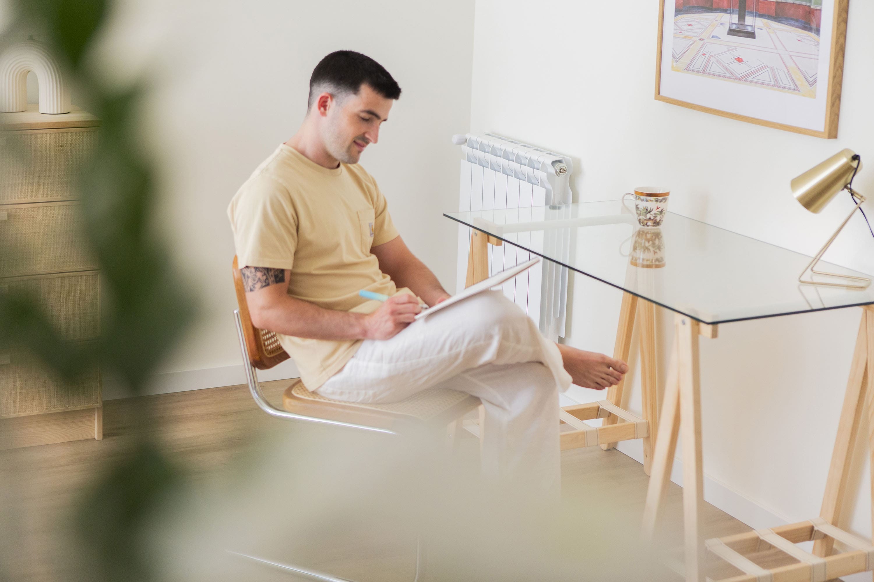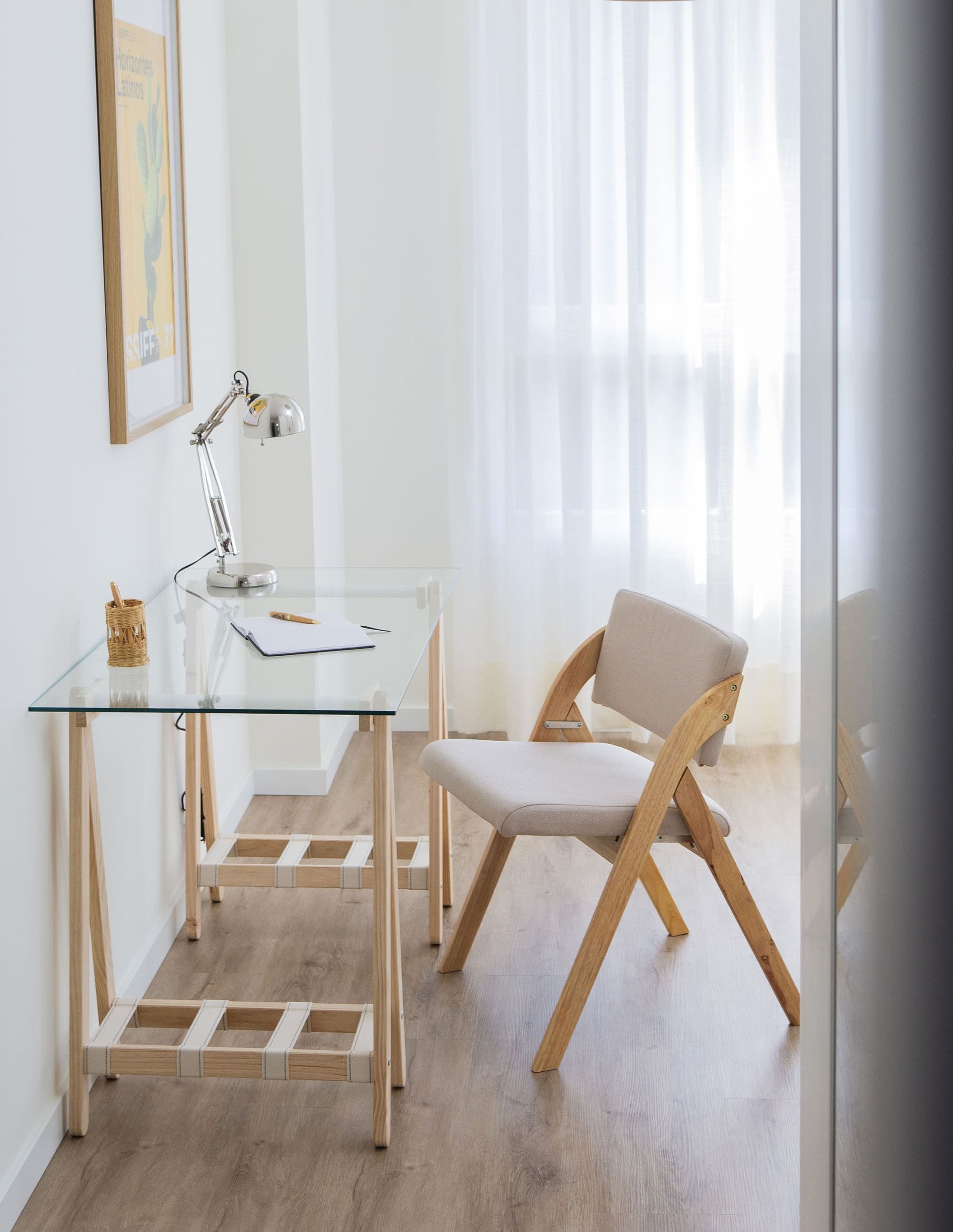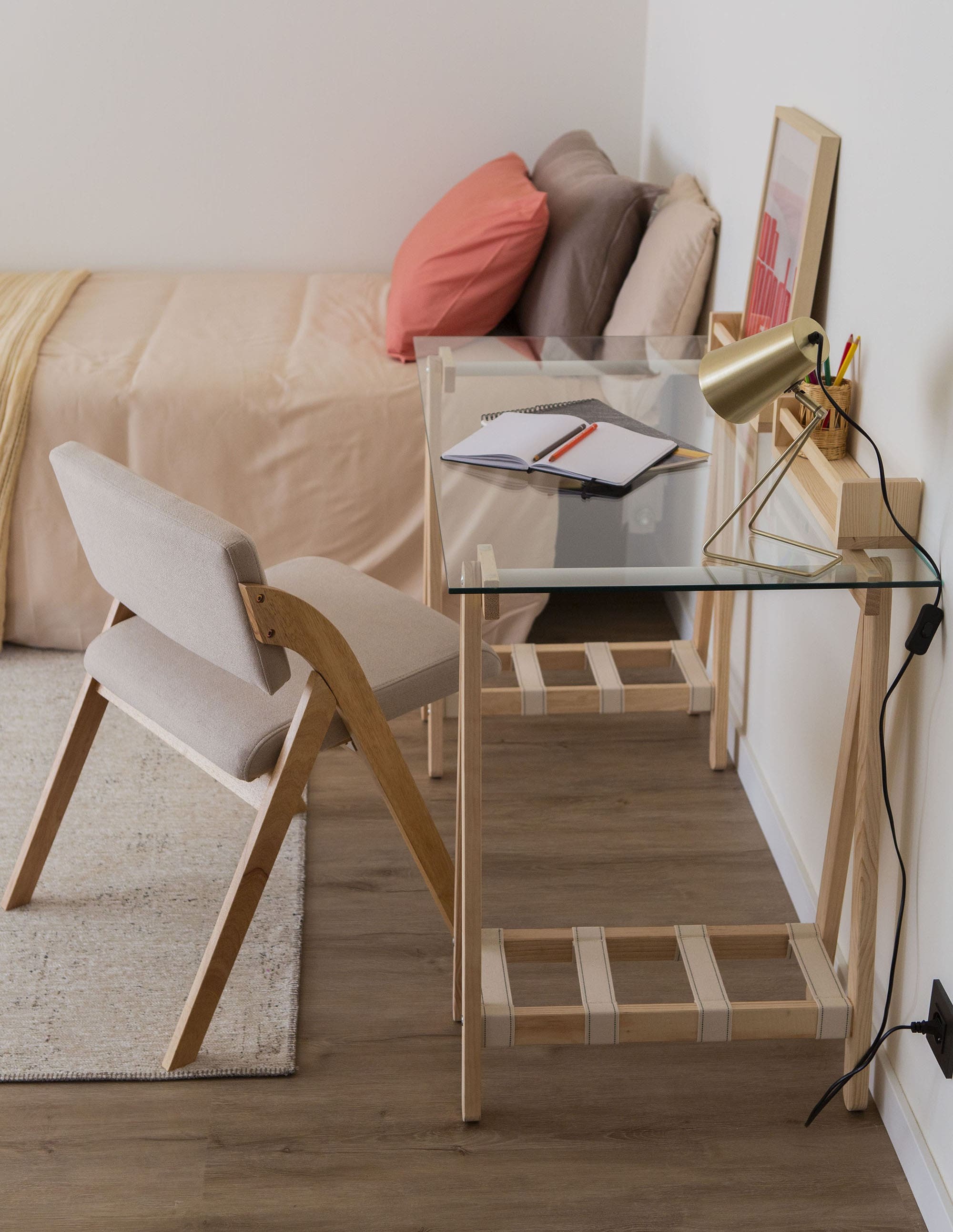 Si combinas este cristal para mesa con nuestras patas de madera ANCORA conseguirás un conjunto estable y lleno de carácter. Madera maciza local con certificado PEFC, tubo metálico blanco mate y cintas de algodón cosidas a mano le darán más firmeza, calidez y un toque artesanal único a tu escritorio.