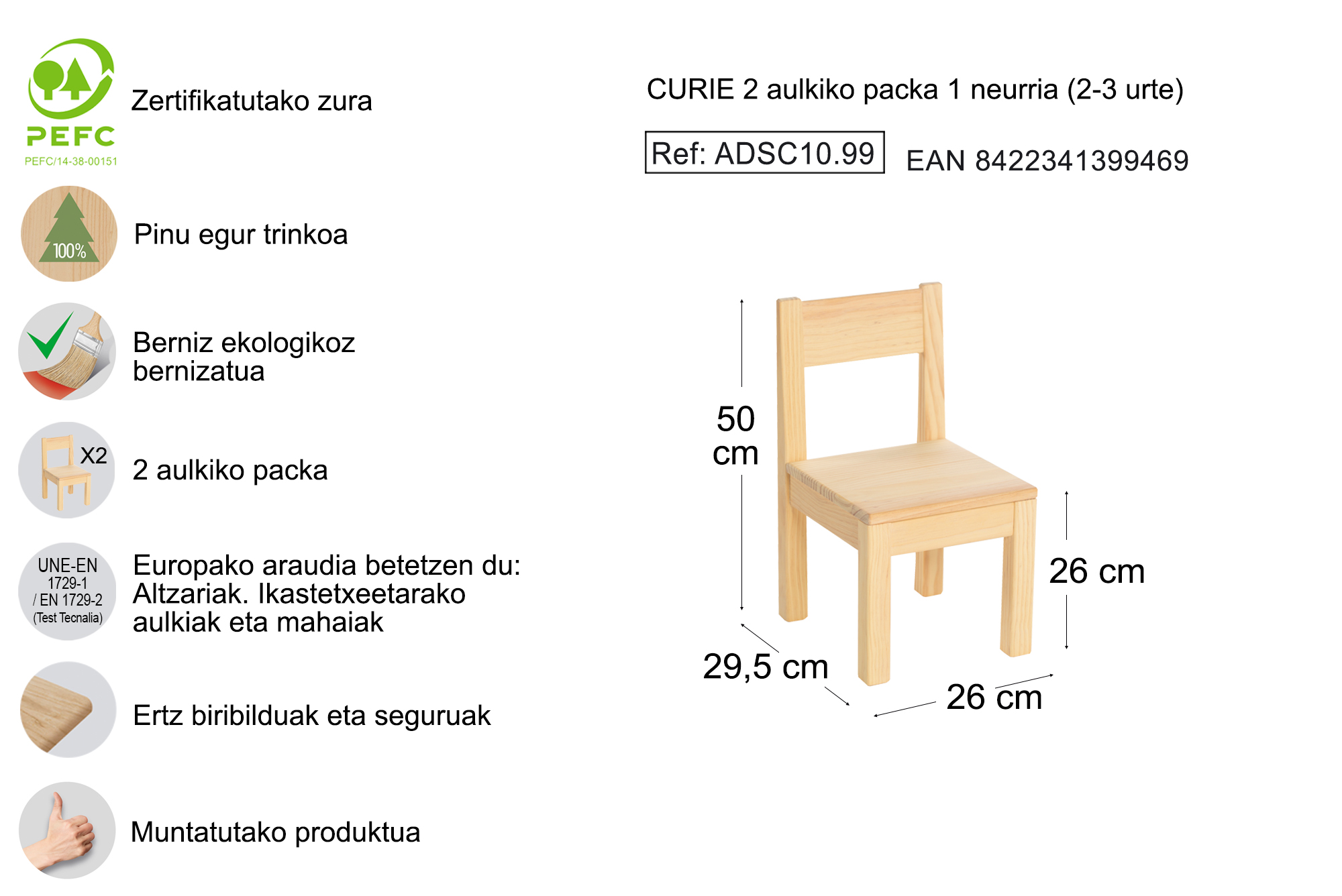 • Haurrentzako zurezko 2 aulkien pakete batean datoz, 1. neurria