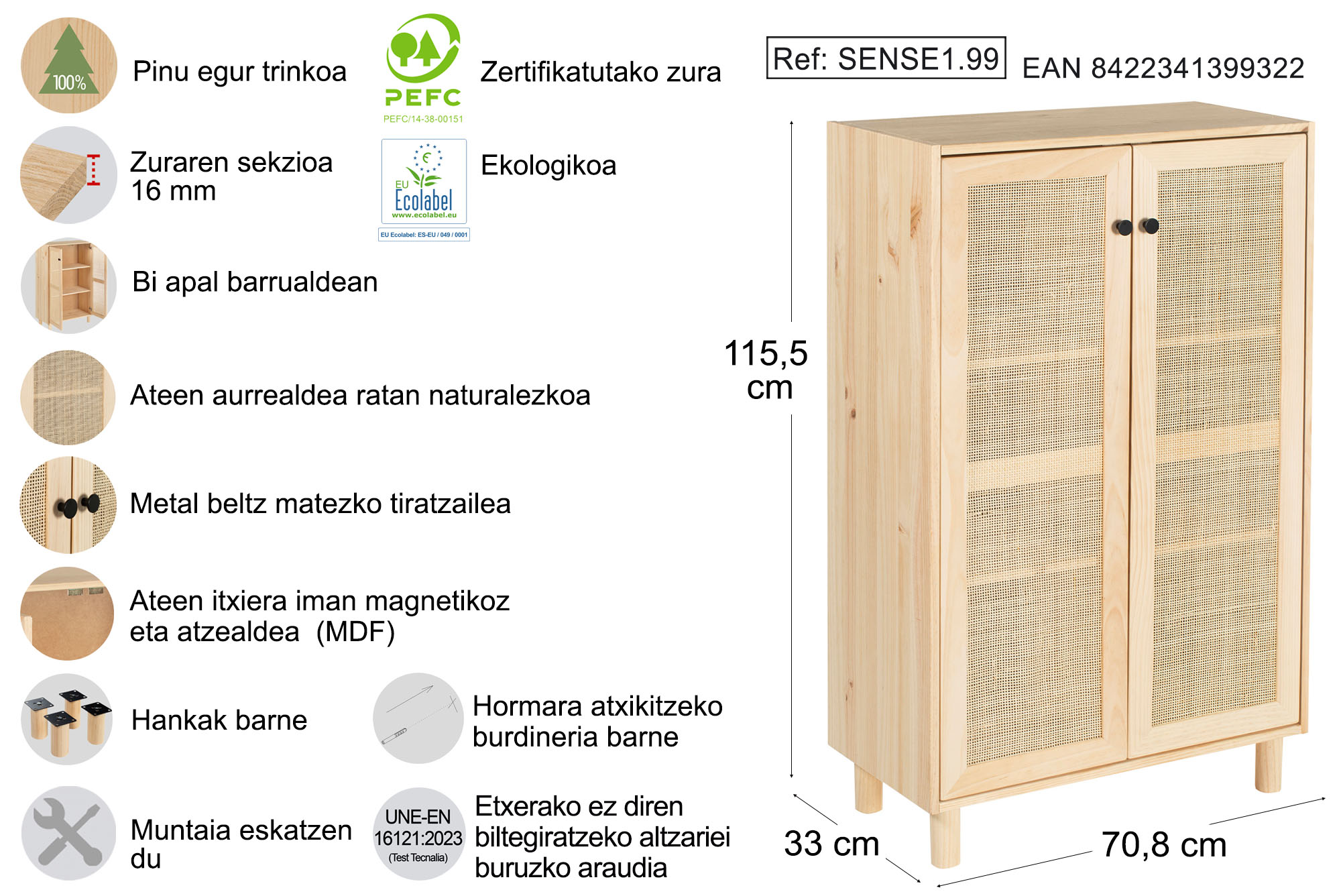 SENSE 2 ateko rattan armairuak barruko bi apal ditu, eta leku zabala eskaintzen du bistatik kanpo gorde nahi duzun guztia gordetzeko. Bere rattan ateek metalezko helduleku beltzak dituzte akabera matearekin , eta hanka biribilak pinu egurrezkoak dira. Ateak gure artisauen artearen eta dedikazio zorrotzaren lekuko dira. Ratanaren juntura bakoitzak eta txirikorda bakoitzak prozesu tradizional honen urrats bakoitzean maitasuna eta maisutasuna islatzen ditu.