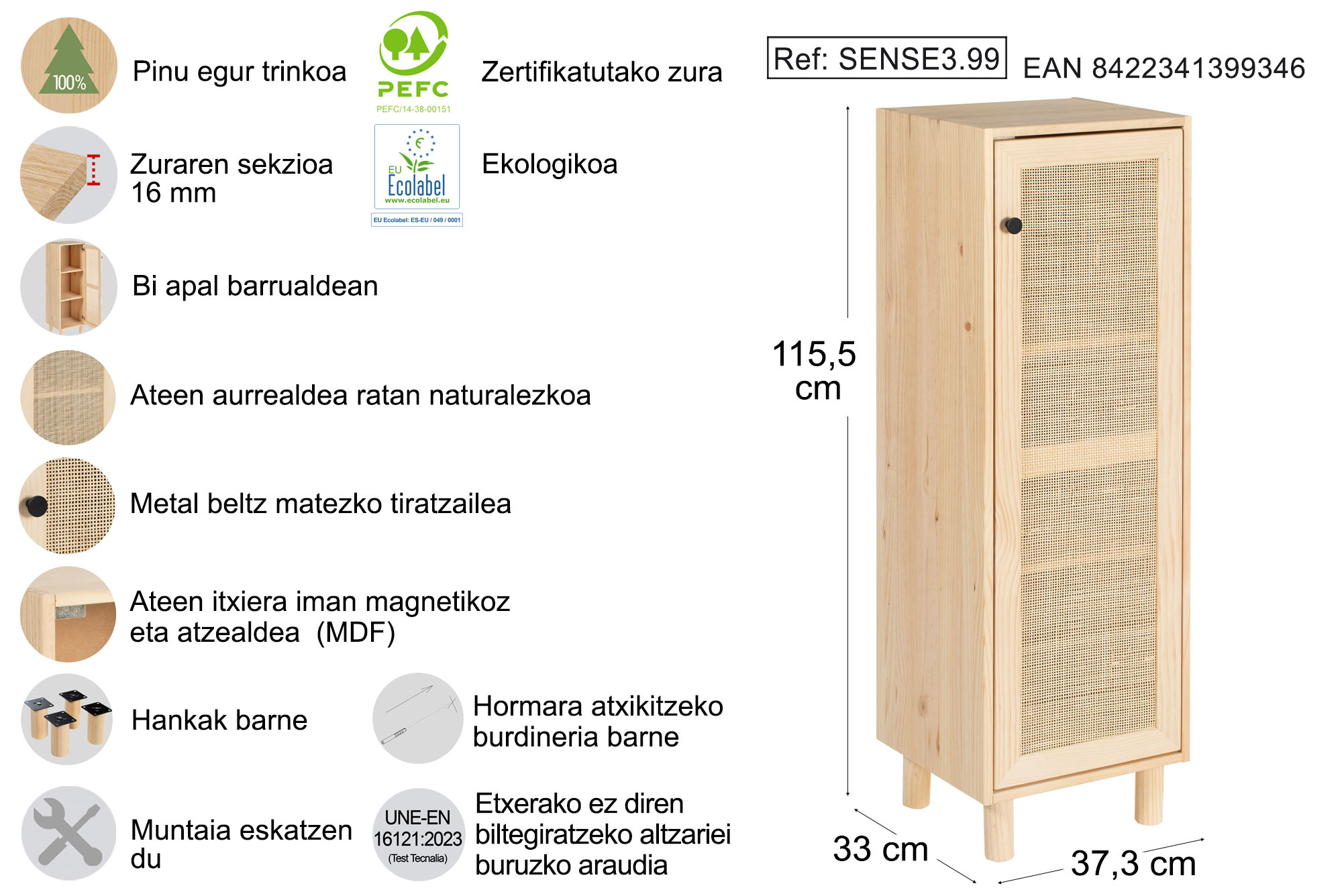 SENSE ratanezko ate bateko armairu bertikalak bi apal ditu, eta leku zabala eskaintzen du begi-bistan eduki nahi ez duzun guztia gordetzeko. Ratanezko ateak akabera mateko metal beltzezko heldulekua du; hanka biribilak, bere aldetik, pinu-zurezkoak dira. Atea gure artisauen artearen eta ardura zorrotzaren erakusgarri da. Juntura bakoitzak eta ratanaren eskuz egindako txirikorda bakoitzak maitasuna eta maisutasuna islatzen dituzte tradiziozko artisau-prozesuaren urrats bakoitzean.