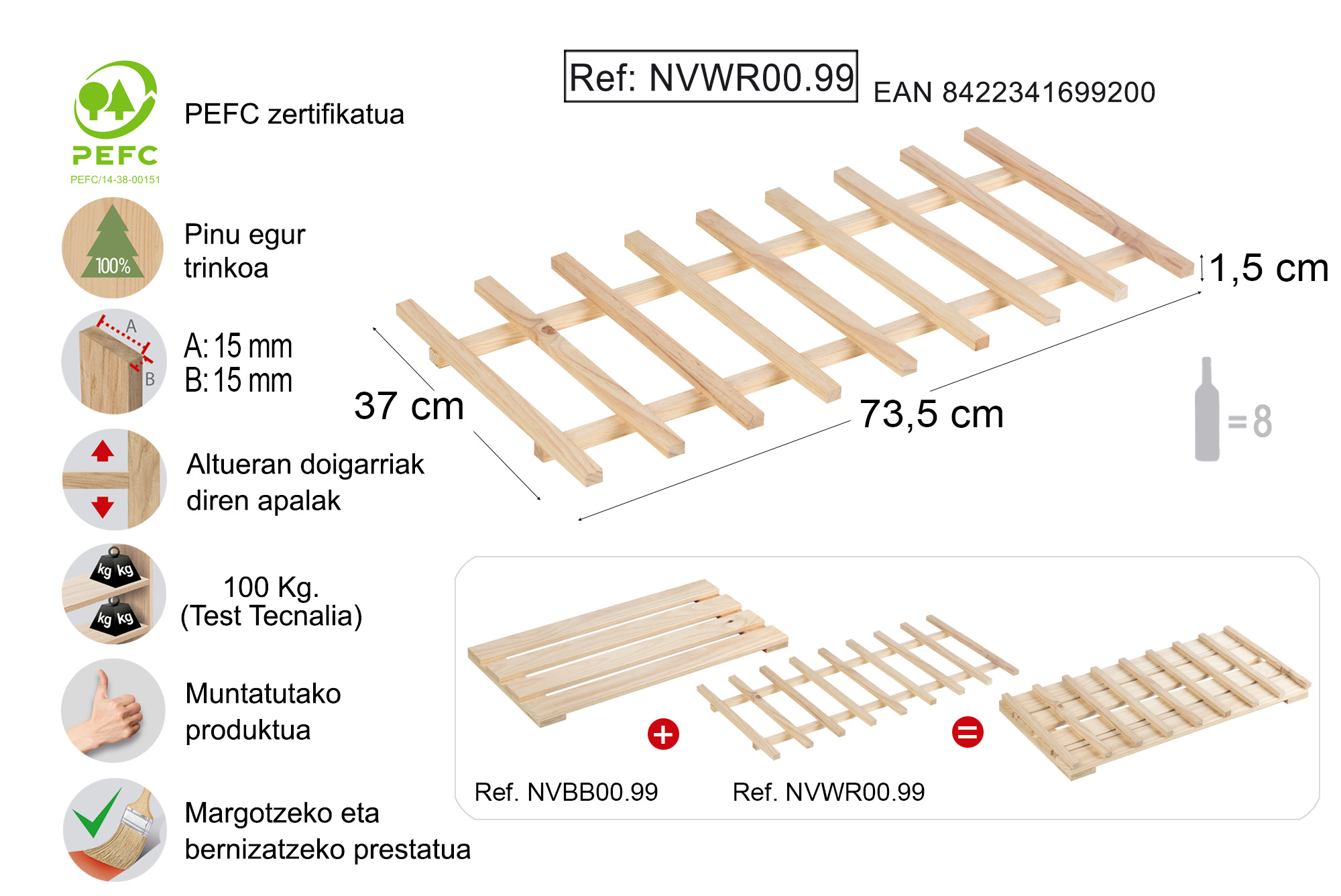 Botila egokitzaile hau Astigarraga Kit Line EVOLUTION serieko apaletarako osagarri esklusiboa da. 174,5x76,5x38,5cm (altuera/zabalera/sakonera) eta 110x76,5x38,5cm (altuera/zabalera/hondoa) apaletako edozein apaletan, botila egokitzaile hau gehi dezakezu. Soluzio praktiko eta apaingarria zure biltegian (ganbara, garajea, despentsa...) 8 botila arte modu antolatuan gordetzeko.