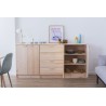 Bere bi ateen atzean, PEFC ziurtagiria duen pinu egurrezko ontzitegi honek, zur trinkozko bi apal ditu, dena txukun mantentzeko espazio gehigarria eskaintzen dutenak, beti ere bistatik kanpo eta hautsetik babestuta. Egurrezko heldulekuak, sinpleak eta diskretuak, diseinuan integratzen dira eta aire lasai eta orekatua ematen dute.