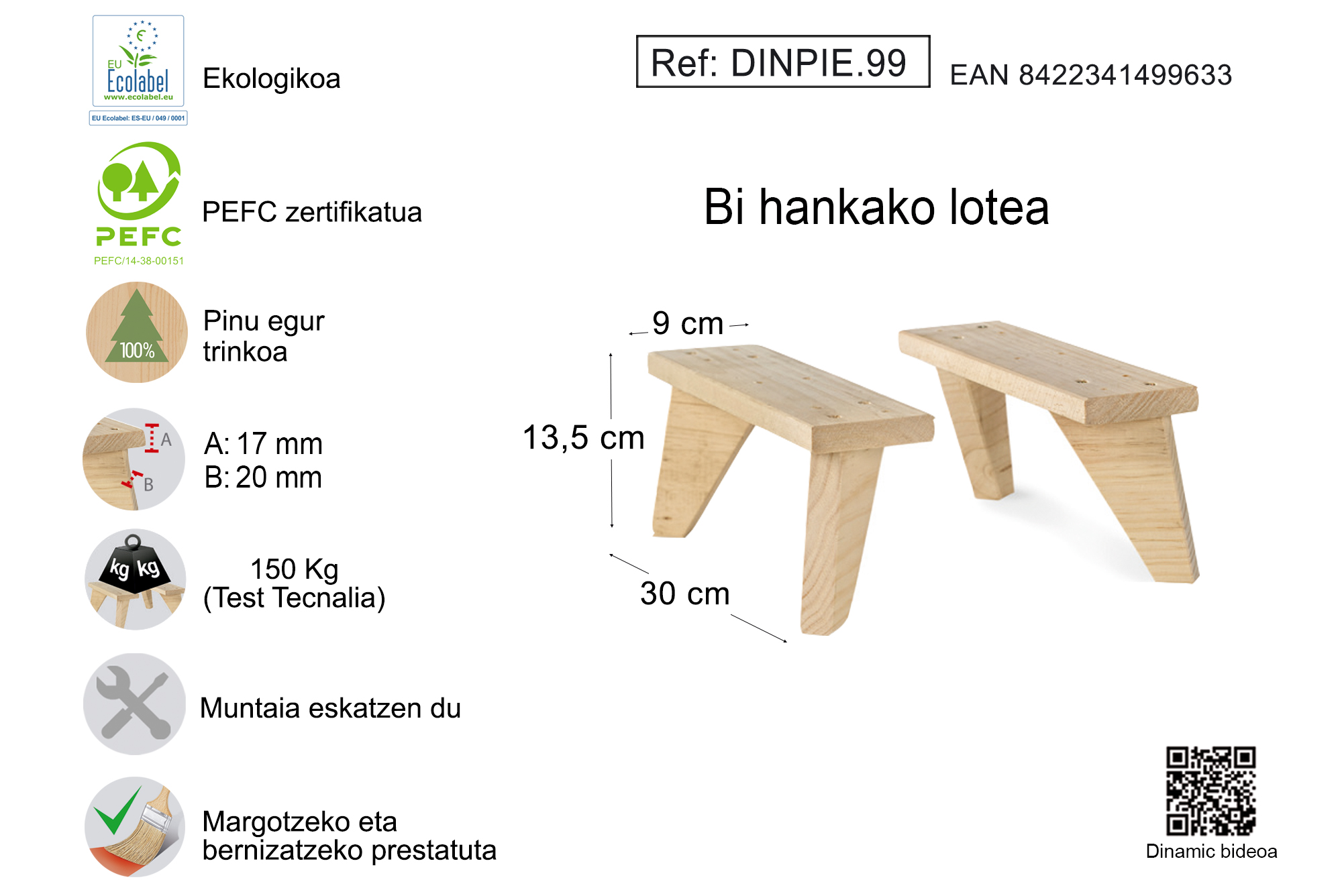 13,5 cm-ko altuerako pinu trinkozko egurrezko 2 hanka-kit