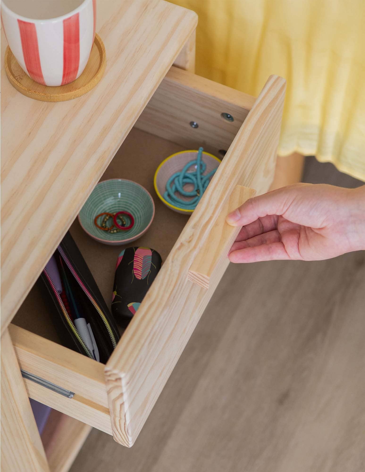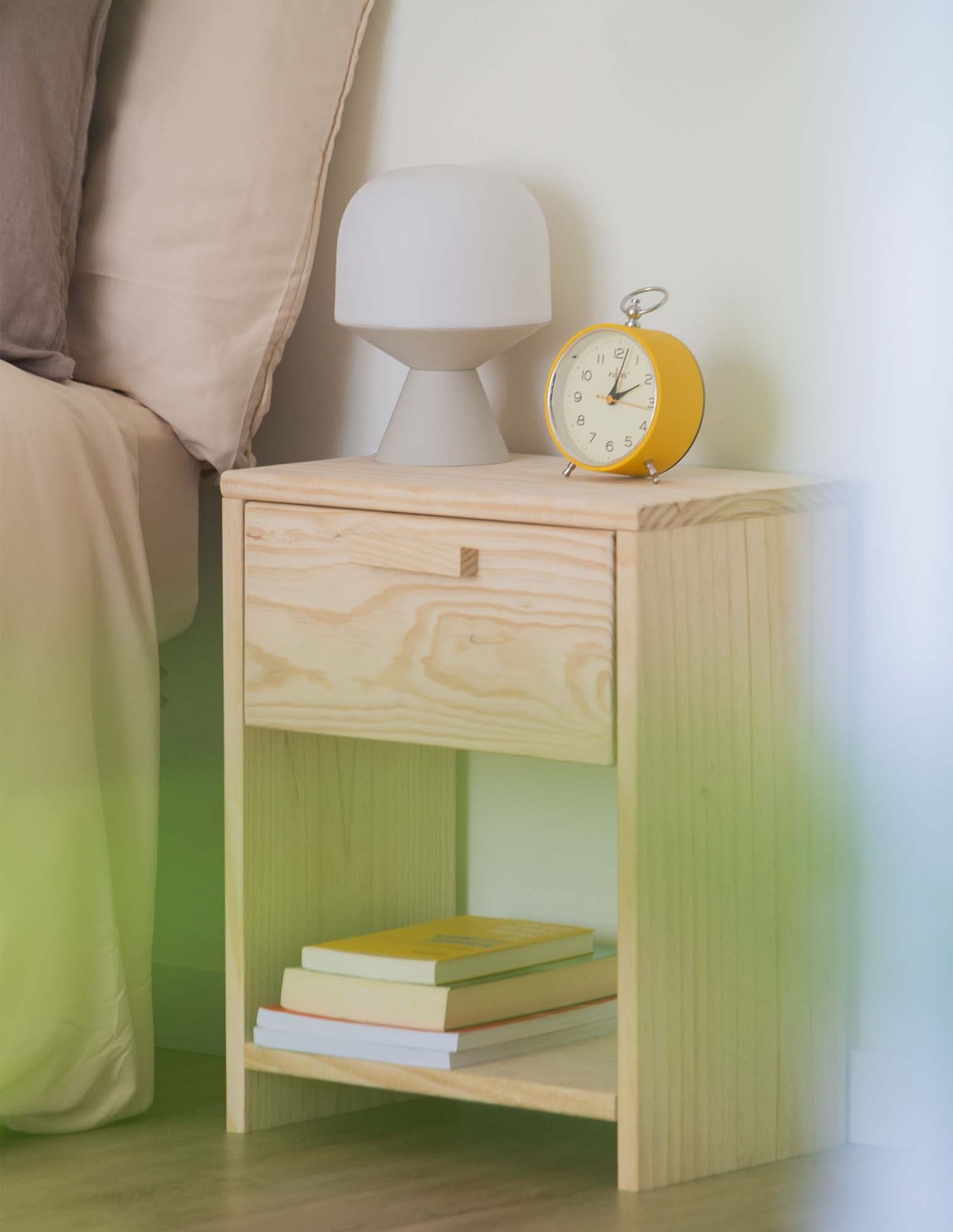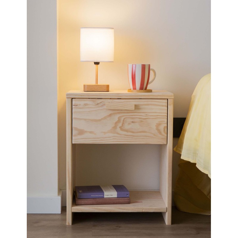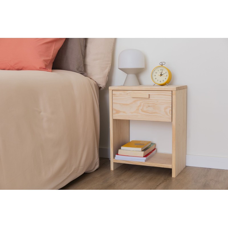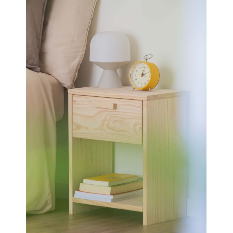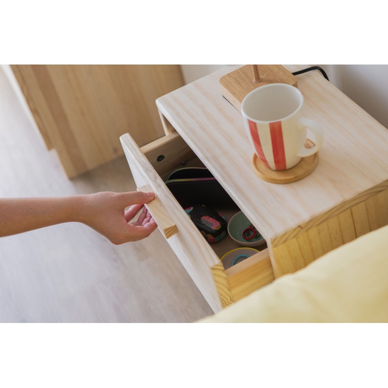 PEFC ziurtagiria duen pinuzko gau-mahaitxo honek kalitatezko gida lerragarri metalikoz hornitutako tiradera bat dauka, irristatze leun eta iraunkorra ziurtatzen duena. Horrez gain, behealdean, liburuak, osagarriak eta eguneroko objektuak eskura izateko apal aproposa du. Bere egurrezko helduleku xume eta naturalak, lasaitasuna transmititzen duen diseinu garbia osatzen du.