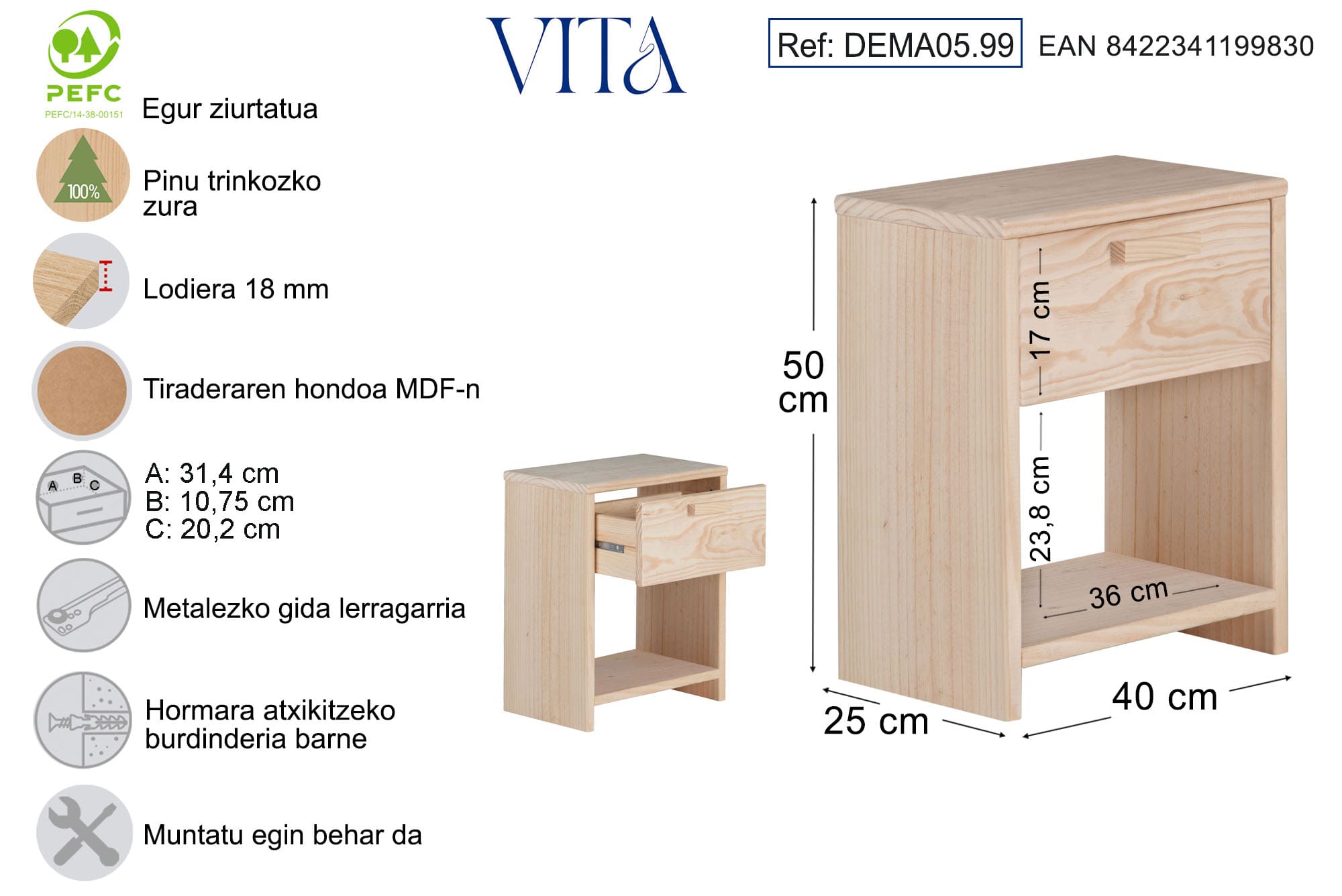 VITA pinuzko gau-mahaitxoa altzari osagarri bat baino askoz gehiago da: egunerokorako lankide praktikoa da, dena txukun mantentzen laguntzen dizuna zure espazioa goxotasunez eta naturaltasunez betetzen duzun bitartean.
