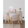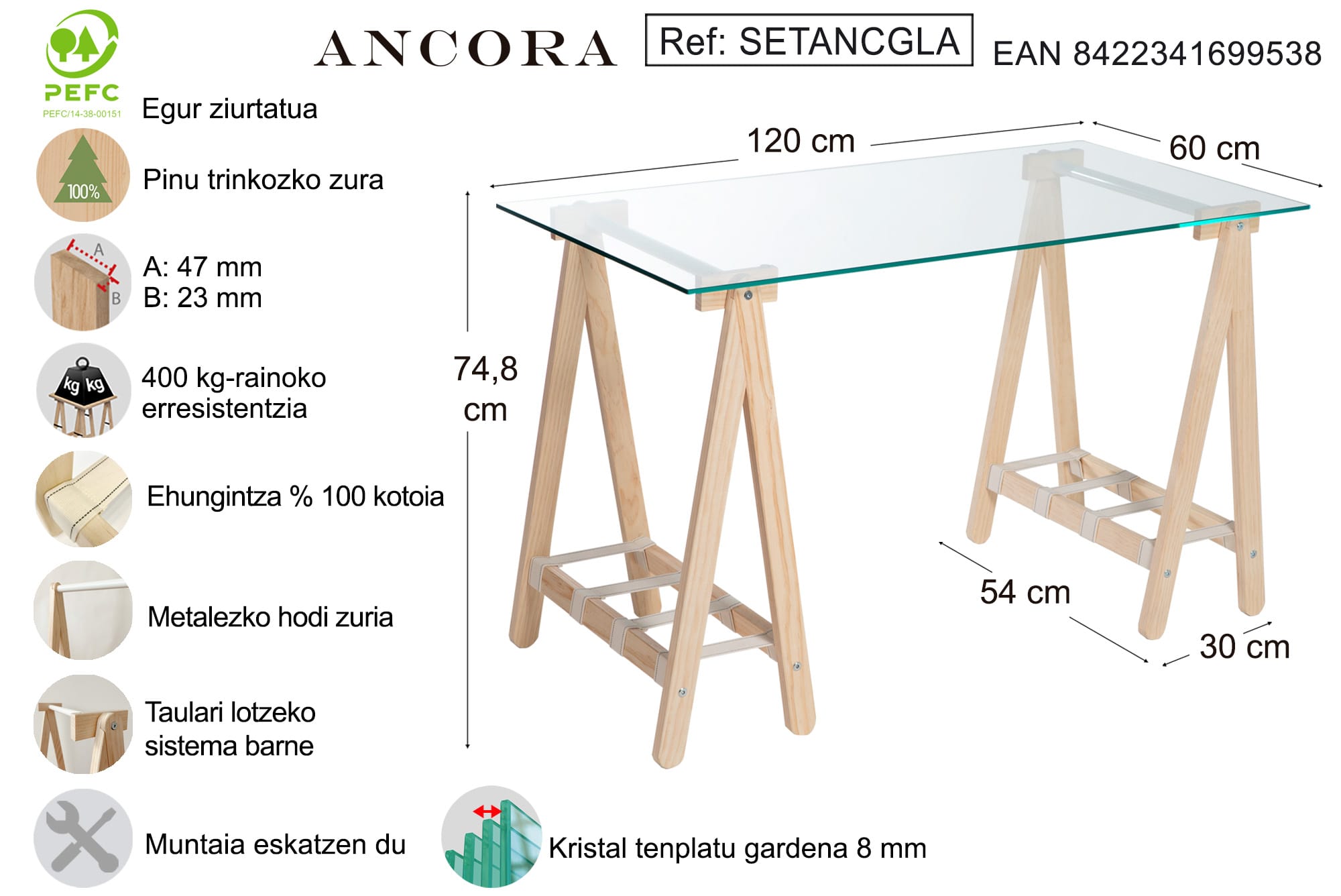 Lanerako eremu argitsuagoa eta funtzionalagoa izango duzu ANCORA kristalezko idazmahai honekin (120 x 60 cm). Beira tenplatuzko estalkiak anplitudea eta arintasuna ematen ditu. Hankak, pinu %100 trinkoa eta tokikoa, metalezko tutu zuri bat eta %100 kotoizko zintak ditu, eskuz josita. Erresistentzia handiena bermatzen duen euskarria: ANCORA hankek 400 kg-rainoko euskarria dute, eta zentro teknologiko batek probatu ditu.