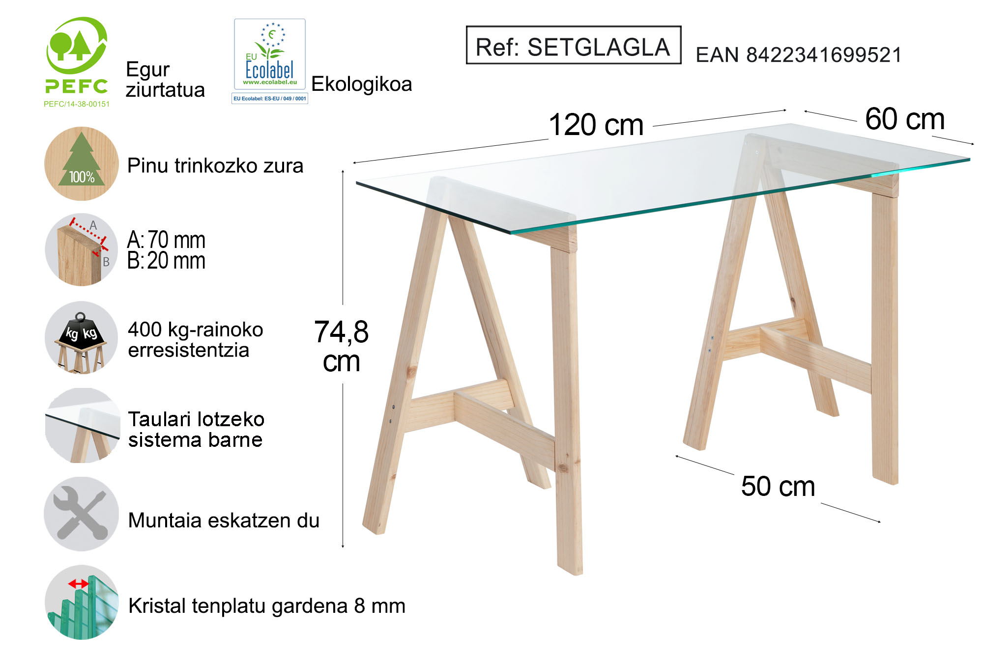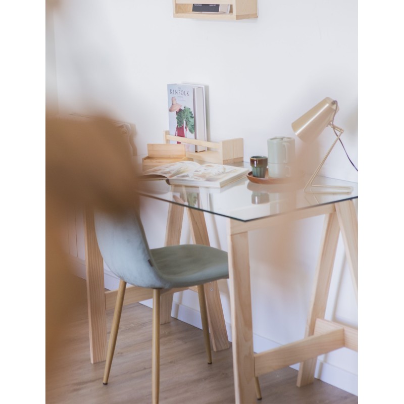 120x60 cm neurria duen GLAM kristalezko mahaigain hau, irtenbide praktikoa da etxean ikasteko edo lan egiteko, baita eremu eroso eta egonkorra sortzeko ere. Beira tenplatuzko taulak arintasun bisuala ematen du, eta erraz integratzen da gazte-espazioetan, home officean edo bulegoetan. %100 trinkoa eta tokikoa den pinu egurrezko hankak, hankentzako espazio librea uzten duen aurrealdeko egitura hanka-bakar batekin diseinatuta daude. Erresistentzia bermatua dute: 400 kg-ko pisua jasan ditzakete, zentro teknologiko batean egindako proben arabera.