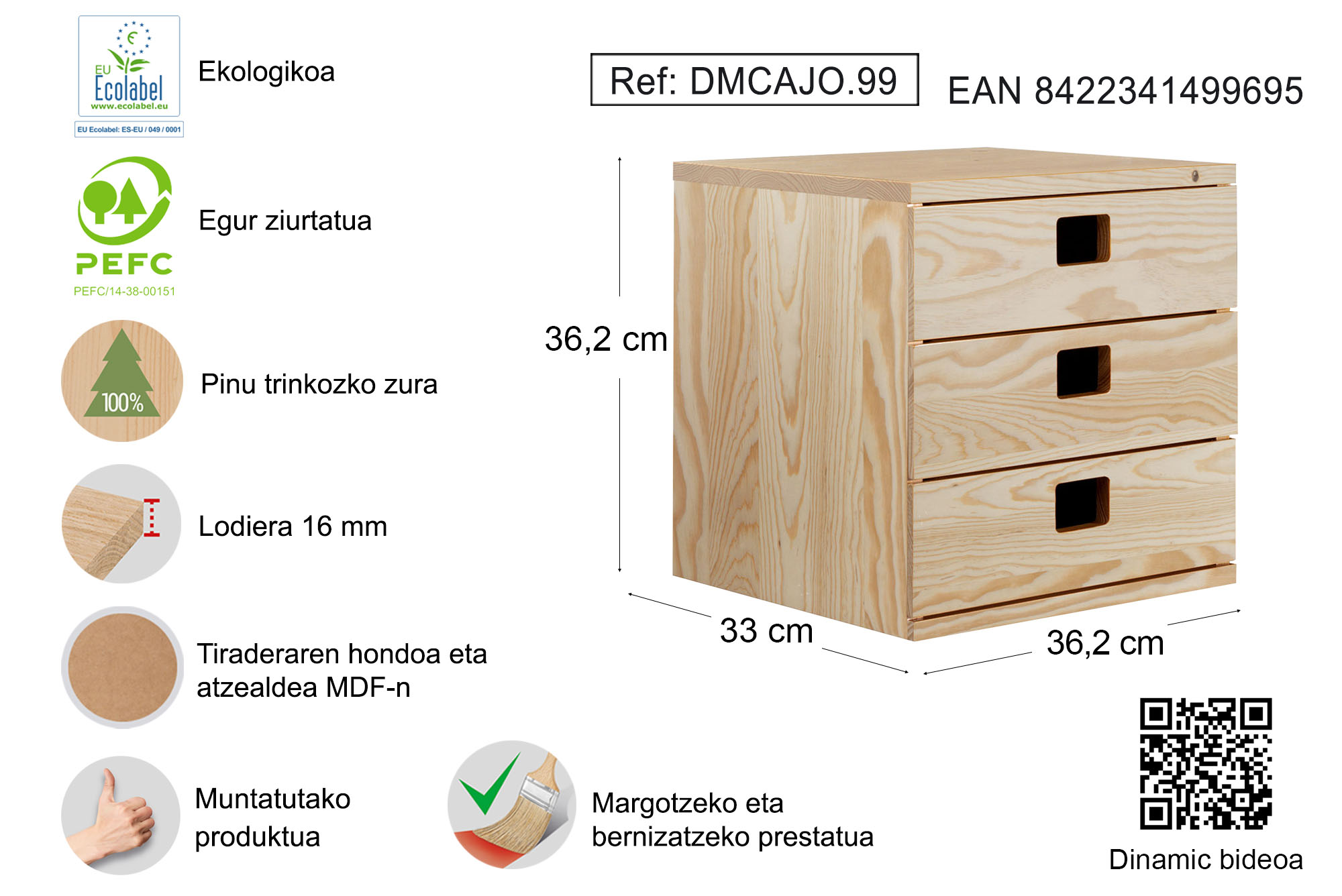 Baliteke 3 tiraderadun komoda bat bakarrik ikustea, baina askoz gehiago da. DINAMIC seriekoa da, kubo-apalategi modular tradizionalez osatuta dagoen familia. Pinu trinkozko egurrezko tiradera-unitate honek ordena mantentzen lagunduko dizu eta tiradera bakoitza gauza batera esleitzen lagunduko dizu. Pentsatzen duzun adina lekutan jar dezakezun pieza polifazetikoa eta hiru tiraderetan ere eskuragarri dago.