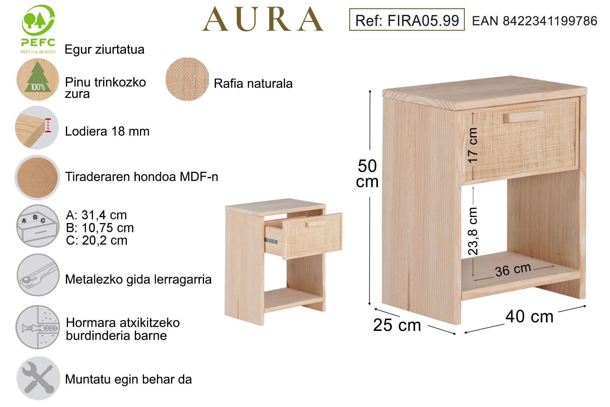 Errafiaz eta egur naturalaz egindako AURA gau-mahaitxoa, AURA bildumako pieza bat da, xehetasunetan naturaltasuna aintzat hartu eta logela abegitsu baten bila dabiltzanentzat pentsatua. Jatorri jasangarriko pinu egur trinkoz egina, PEFC ziurtagiriarekin, errafiazko gau-mahaitxo honek praktikotasuna eta estetika uztartzen ditu, estilo apaingarri desberdinetara erraz egokitzen den diseinu atenporal batean.